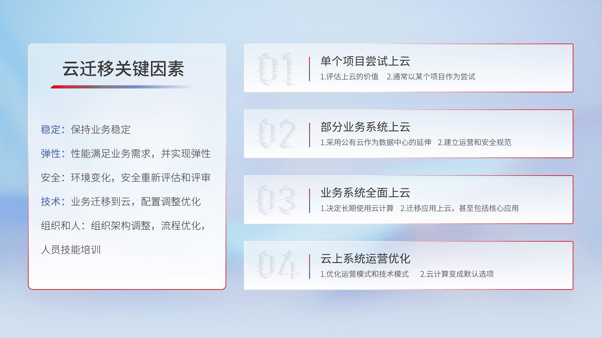 结合实际业务,,,从规划设计、、、、云平台选型、、、云原生改造、、、数据迁移、、、集成交付,,迁移全过程为客户识别最佳上云路径,,,做好风险识别管理,,,设计网络架构、、身份权限、、、安全审计合规、、、、操作审计、、日志审计、、监控告警策略、、、多站点容灾设计等,,,对云上基础设施进行整体规划,,,,提升IT治理水平,,以满足弹性、、、高可用、、、、高性能的需求。。。。