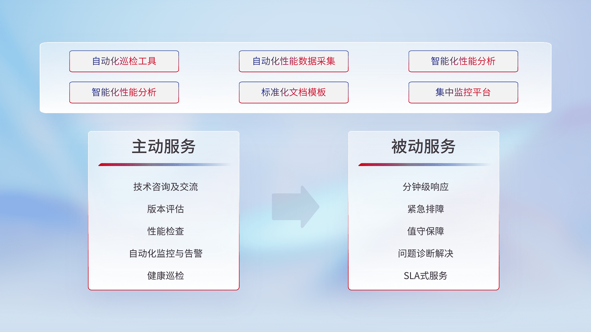 智能化工具和标准化文档,,,,保障服务质量,,提供主动服务(包含技术咨询、、、、版本评估、、、、性能检查、、自动化监控与告警、、、、健康巡检)和被动服务包含(分钟级响应、、、、紧急排障、、值守保障、、、问题诊断解决、、、SLA服务)。。。。